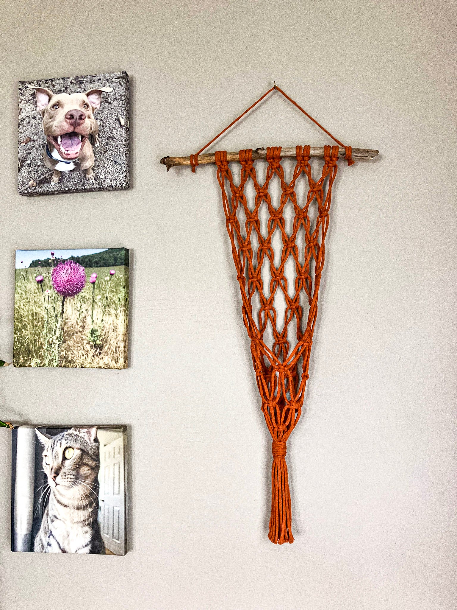 This hanger measures about 25n. from dowel rod to the tail and will fit almost any sized pot from 3” to 6”. Pots shown in photos are about 4"
