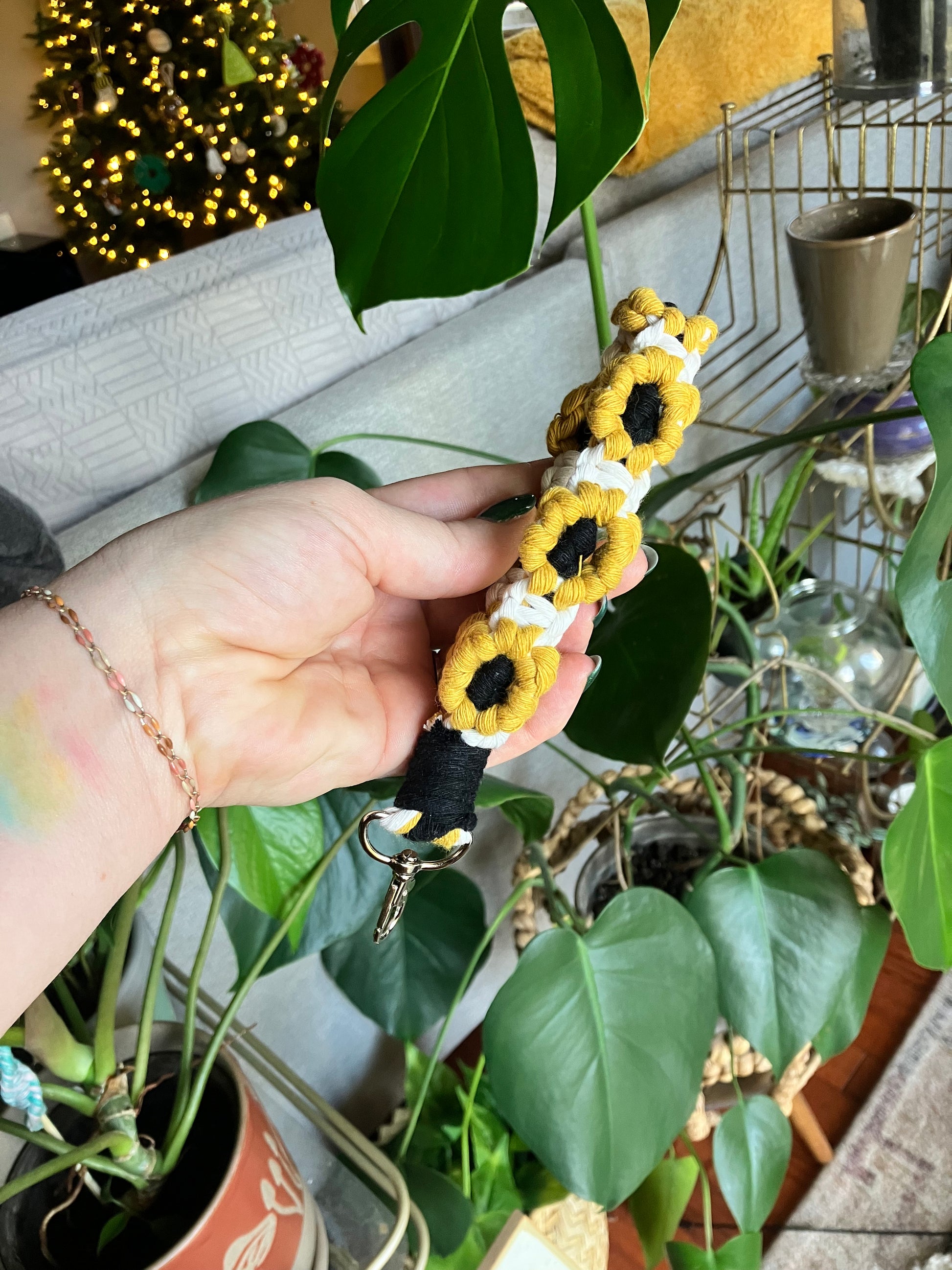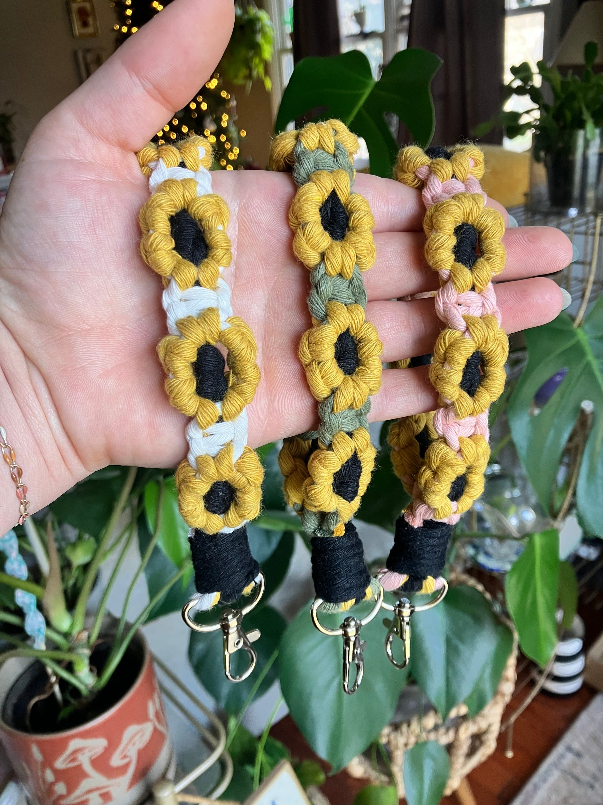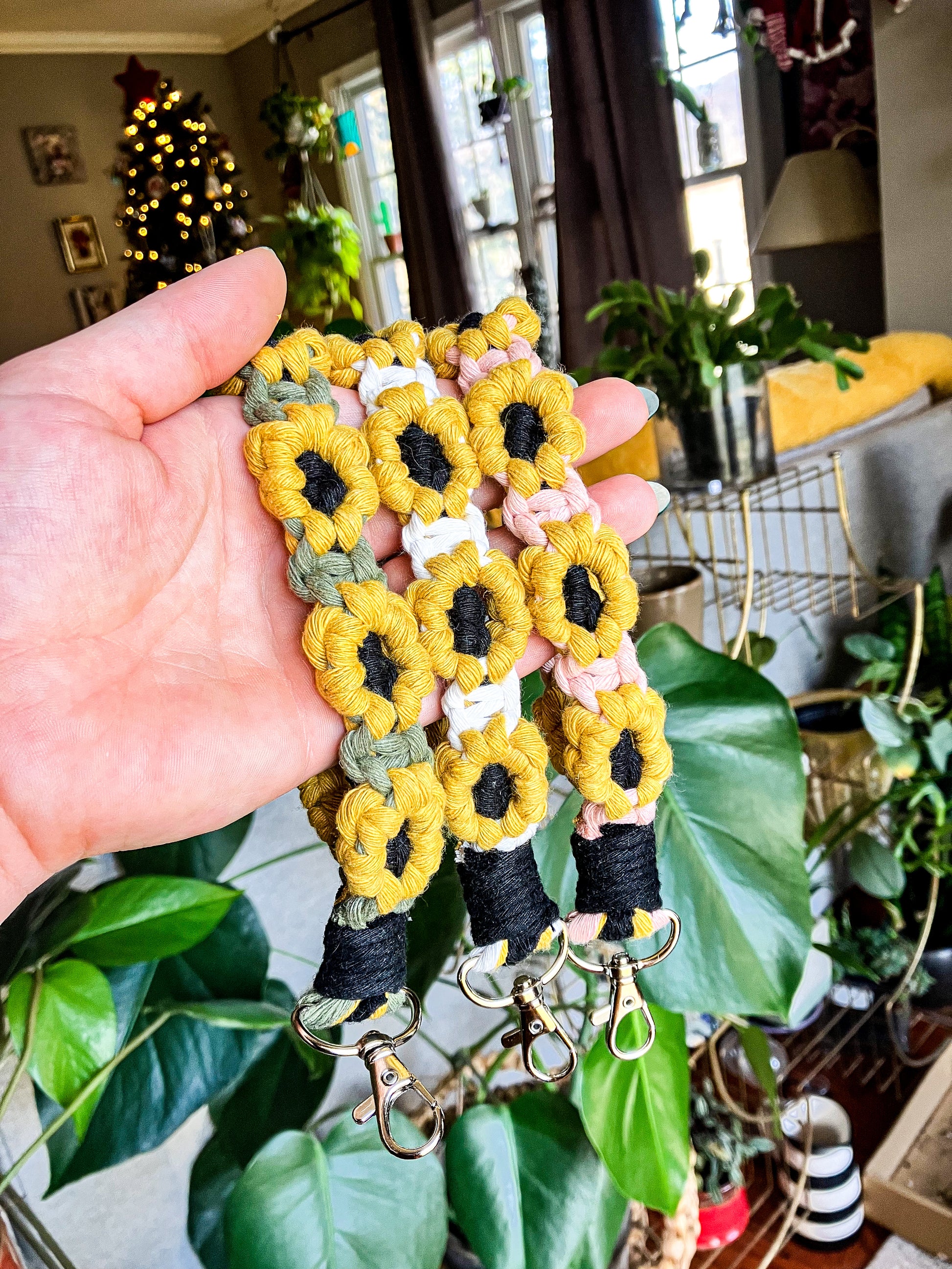 Elevate your everyday essentials with our macrame sunflower wristlet keychains