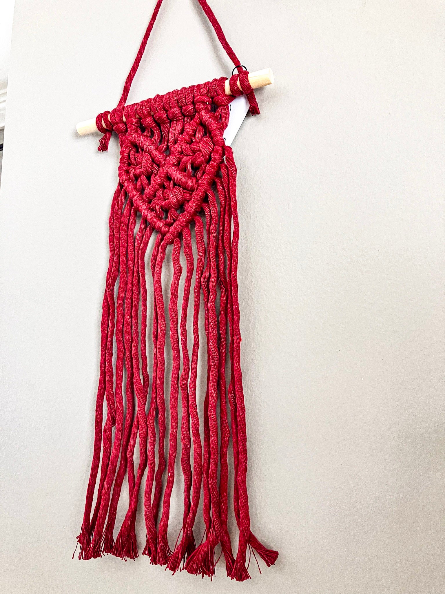 Elevate your wall decor with our unique macrame Mini Heart Wall Hanging. Handcrafted with care using recycled cotton cord, this statement piece is made on a 6 inch dowel rod. With lengths varying around 10 inches, each creation is truly one-of-a-kind. Add a touch of bohemian charm and celebrate all love with this beautiful macrame wall hanging.